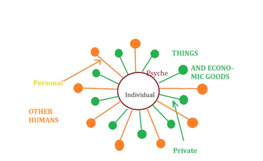 Personal one relates to the interactions with other humans. Private one meanwhile touches relationships with things (items, belongings) and economic goods (which are not only material).