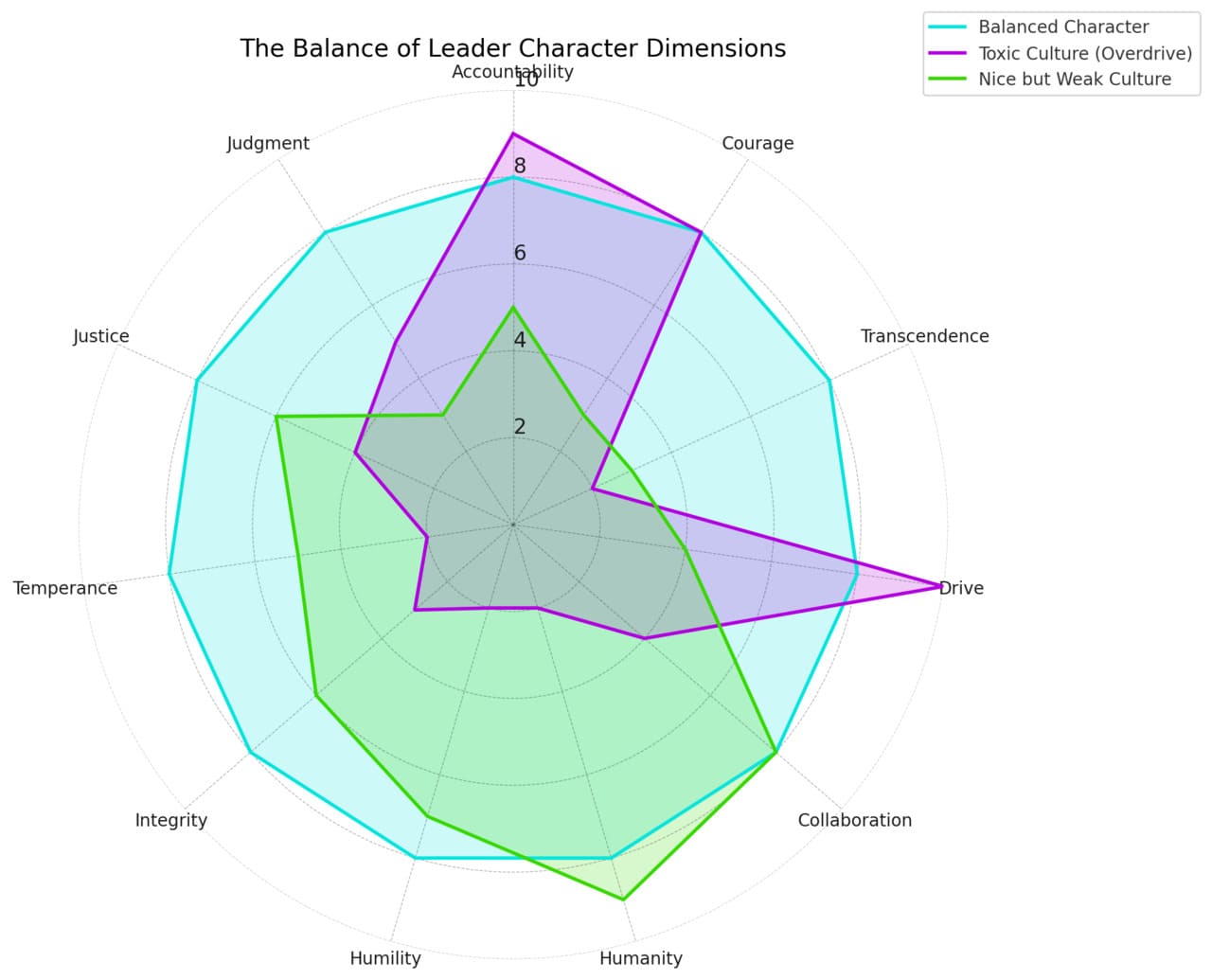 Character is not just about ethics or morals. According to extensive research from the Ivey Business School, it is an interconnected system of 11 virtuous habits that define a person’s judgment and influence their effectiveness: Accountability, Courage, Transcendence, Drive, Collaboration, Humanity, Humility, Integrity, Temperance, Justice, and Judgment.