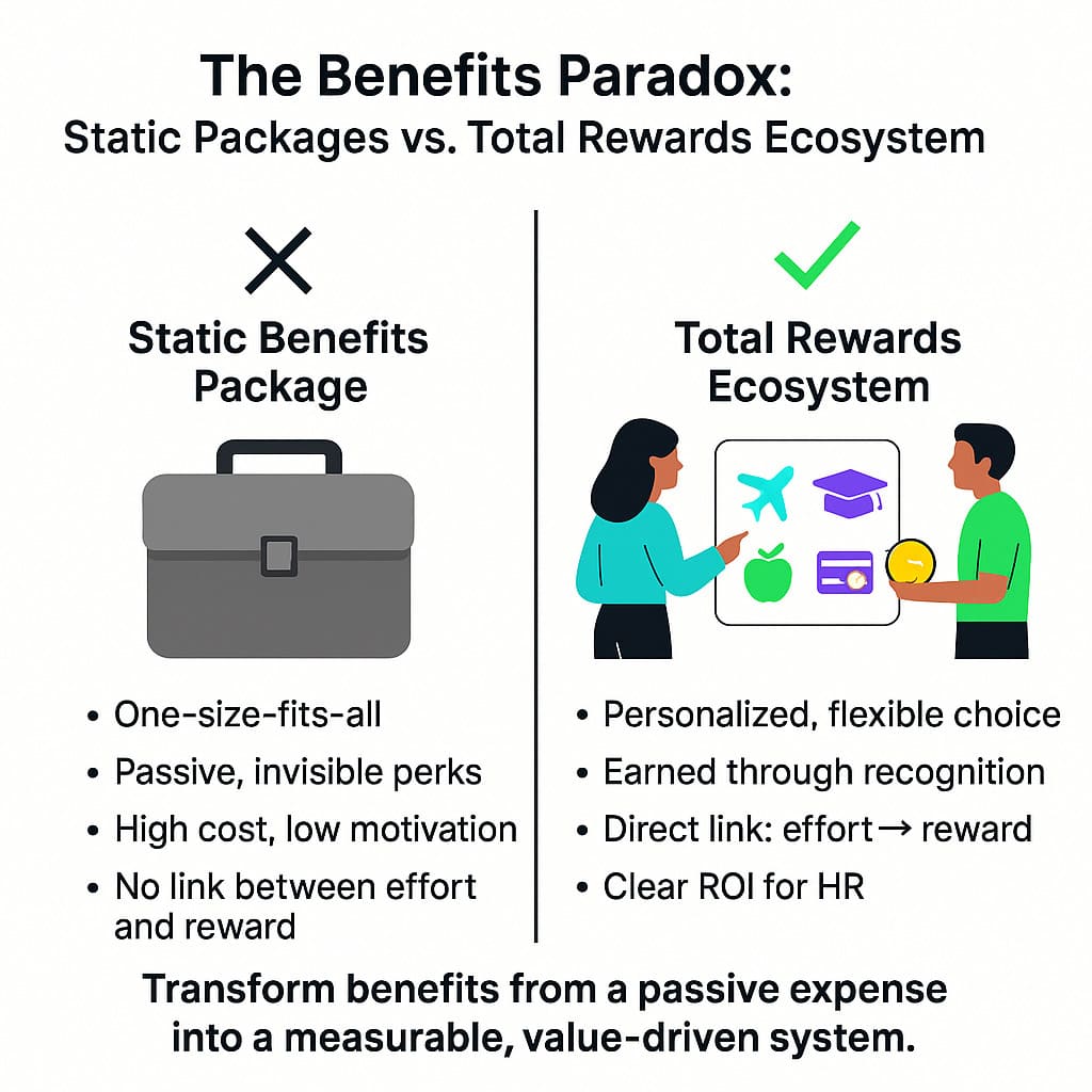 European companies are investing more than ever in comprehensive employee benefits packages, yet are seeing diminishing returns in motivation and engagement. This paper argues that the issue is not the value of the benefits themselves, but the outdated, passive model of their delivery. When benefits are disconnected from an employee’s daily contributions, they are perceived as an entitlement rather than a reward, leading to what we term the “Benefits Paradox”: a high-cost, low-impact system. We propose a strategic shift from a static benefits package to a dynamic “total rewards” ecosystem. In this model, employees convert their recognized contributions into a personalized selection of benefits, transforming a passive corporate expense into a powerful tool for reinforcing desired behaviors. This approach not only increases the perceived value of existing benefits but also provides leaders with a clear, measurable return on their cultural investments.