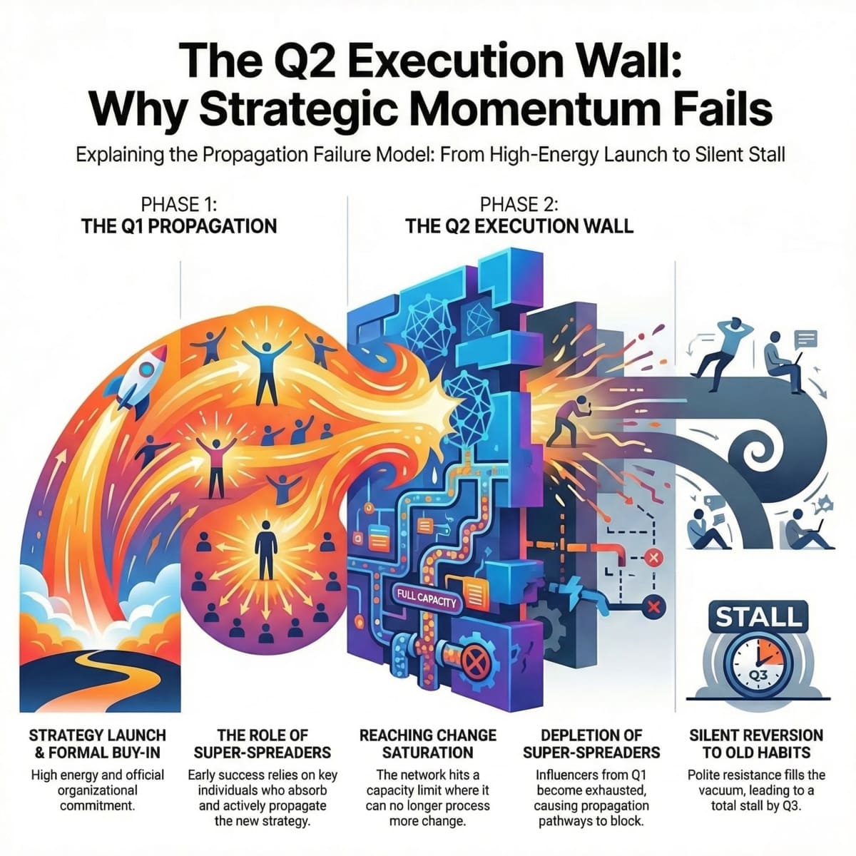The pattern is consistent: Q1 momentum is real but finite. It is carried by the energy of a new mandate and the initial engagement of Super-Spreaders. By Q2, Change Saturation has depleted the network’s adaptive capacity, Super-Spreaders are carrying accumulated Q1 fatigue, and the propagation pathways through which change adoption must flow are either blocked or operating at reduced capacity. The Execution Wall is not a failure of strategy. It is a failure of network energy management.